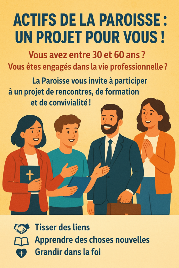 Questionnaire pour les actifs (30–60 ans). La paroisse souhaite mieux connaître les attentes des paroissiens engagés dans la vie professionnelle. Prenez le questionnaire disponible et déposez vos réponses dans l’urne prévue. Merci pour votre participation ! Merci de remplir ce questionnaire et […]