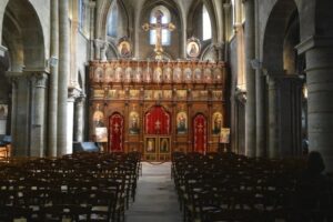 Passant par le square René-Viviani nous admirons le plus ancien arbre de Paris, un robinier planté en 1601 par Jean Robin et arrivons à Saint-Julien-le-Pauvre, une des trois plus vieilles églises de Paris cédée en 1889 au culte grecque-melkite-catholique. L’Archimandrite Nadim Haddad nous reçoit et nous entraîne vers la magnifique iconostase qui sépare l’avant-chœur de l’abside créée et installée en 1891 par Girgi Bitar ébéniste damascène – inventeur de la mosaïque sur bois – restaurée par son petit-fils Gaby Bitar en 2012. Le rang supérieur composé de 13 icônes avec le Christ au centre entouré des 12 apôtres avait été enlevée dans les années 1950 pour donner plus de visibilité à l’abside. Onze d’entre elles ont été retrouvées et restaurées par des professionnels français qui ont aussi créé les deux manquantes et le tout a été replacé.